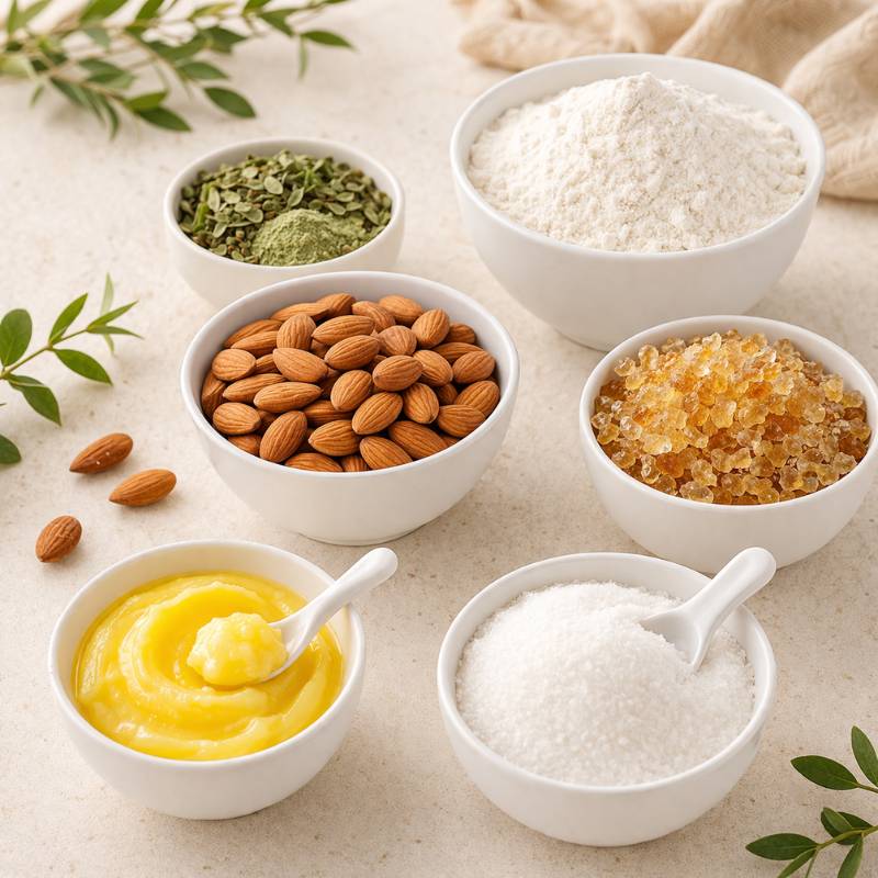 Wheat Flour, Almond, Gond/Dink , Cardamom and Ghee.